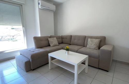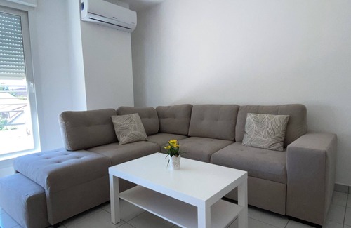 Relax in the cozy living room featuring a comfortable sofa bed, perfect for extra guests. Whether it’s a warm summer day or a chilly evening, the apartment’s air conditioning and heating will keep you feeling just right. The modern bathroom is equipped with a hair dryer to help you get ready with ease.