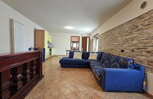 The apartment, located on the first floor of a stone farmhouse, features an entrance leading to a spacious living area with a kitchenette.
