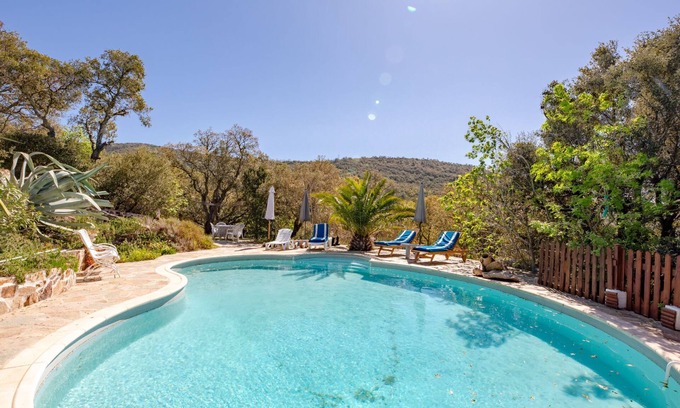 House "La Sacherie de l'Autourière". 6 km from the centre of La Garde-Freinet, 7.5 km from the centre of Grimaud, 10 km from the centre of Cogolin, in a secluded position on a slope, 13 km from the sea. Private: natural state property 30'000 m2, terraced garden with wildlife garden and trees, swimming pool kidney shaped (10 x 6 m, seasonal availability: 15.Mar. - 15.Nov.) with alarm system. Bumpy motor access (2.2 km via unmade road). Parking on the premises. Shop 4.5 km, supermarket 10 km, bus stop 4 km, sandy beach 13 km.