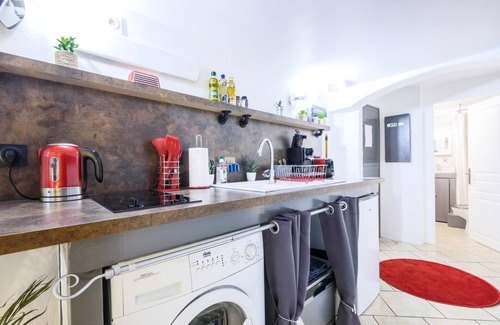 Studio located on the 1st floor including a bathroom (shower and WC), a kitchen area and living room (1 double bed 160x200 cm) with TV connected via Bluetooth, a bathroom (shower with WC). 3 gites in a house adjoining that of the owners, in a residential area, on the heights of Albertville. Entrance common to the 3 gites, spread over half-levels. Studio with air conditioning fitted out in an optimized and functional space, with good comfort. Outdoor parking common to the 3 gites.