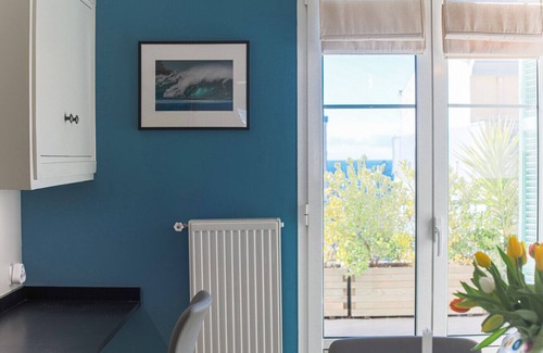 The living room and kitchen open onto the magnificent 35-square-metre terrace, which is very quiet and offers a glimpse of the sea.
