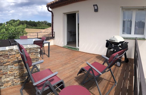 Outside, you have a large private terrace of 22 m2 with a Weber gas BBQ, a dining room, and a relaxation area with two deck chairs and a parasol. You will enjoy the high view of the mountains and the neighboring field.