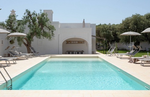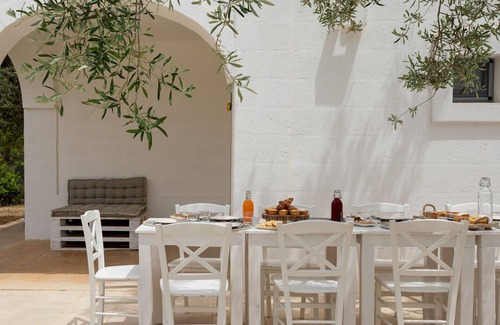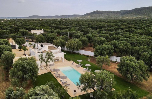 La Torre di Monsignore, a splendid property dating back to the end of the 19th century, has been carefully and precisely restored, with great attention devoted to the architectural preservation and respect for local criteria. The original structure has been enlarged with the construction of a new wing, built with the same criteria, materials and building techniques, which have made it possible to present, at the end of the long restoration, in the summer of 2020, a building of undoubted charm and of considerable architectural impact. The villa, fully air-conditioned, sleeps 12, in fact there are 6 bedrooms including 2 family suites. In addition to the fully-equipped kitchen, there is also an open/closed air-conditioned veranda equipped with thermal break doors and windows, ideal for use 12 months a year. The furnishings have been tastefully chosen and are almost all handcrafted and custom-made. The interiors are enriched with ceramics and objects of the best local typicality and production. The villa, set in a context of centuries-old majestic olive trees, is surrounded by a splendid garden of about 5000 sq m where the large swimming pool stands out, surrounded by a perfectly maintained green lawn and enriched by numerous flowers and ornamental plants. The villa is located in one of the most prestigious areas of the Apulian tourist panorama, between Fasano and Ostuni, in the so-called plain of centuries-old olive trees or historical farms.
