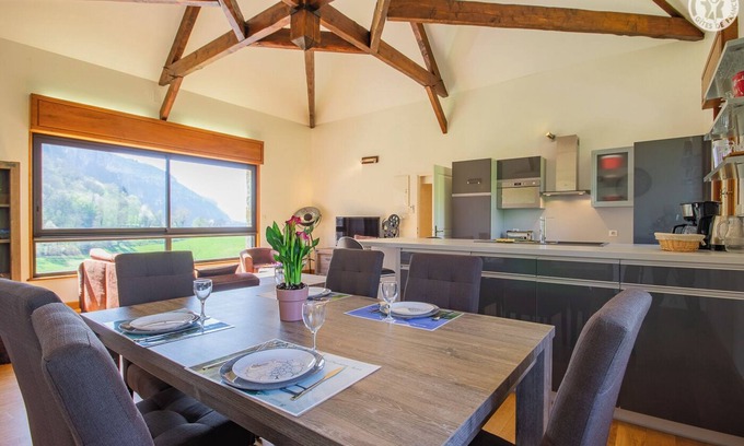 Duplex cottage with independent access via a covered external staircase, comprising on the 1st floor: an entrance hall, 2 bedrooms (1 double bed 140 x 190 cm / 2 single bunk beds, 1 sofa bed for 2 people), a bathroom (shower 70 x 70 cm) with WC), combined washing machine and dryer. 2nd floor: living room-kitchen-lounge with bay windows. Wellness area included in the stay (1h30 per day) including a swim spa, showers, WC, elliptical trainer. Private outdoor space with terrace. Ping pong table. Privilege Card for discounts on certain activities in the area. An exemplary renovation with this large living room and its original visible framework giving volume and light to invest this living space with large bay windows. Sheets and towels are included; the bed is made on your arrival. Bicycles can be stored in a shared and closed room. For your well-being, let yourself be tempted by the counter-current swimming spa and its panoramic terrace.