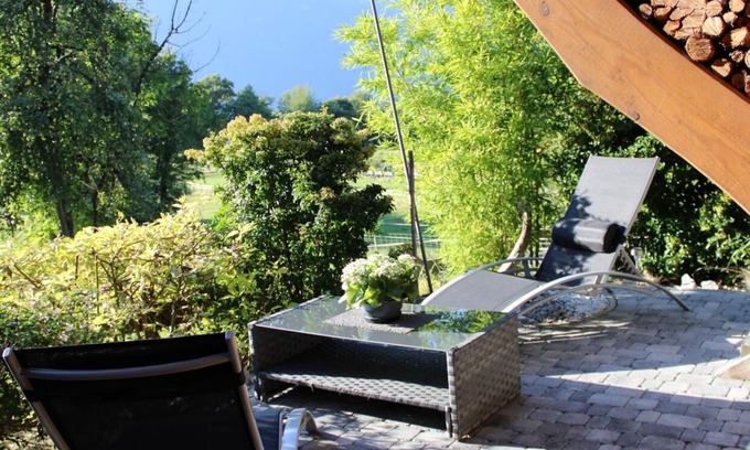 Studio located on the ground floor of the owners' house (independent access via an external staircase of 8 steps): living room-lounge kitchen area (1 pull-out sofa 2 single beds) closed by a curtain, kitchen area, bathroom water (shower and WC). Bedsheets included. Terrace. Private ski room and car park. Reception of horses in the meadow or in boxes on request from the owners. Contemporary house located in the heart of a hamlet on the heights of the valley, 16 km from Albertville. Very comfortable studio, renovated with great care in a mountain style. Beautiful view from the terrace on the Bauges massif.