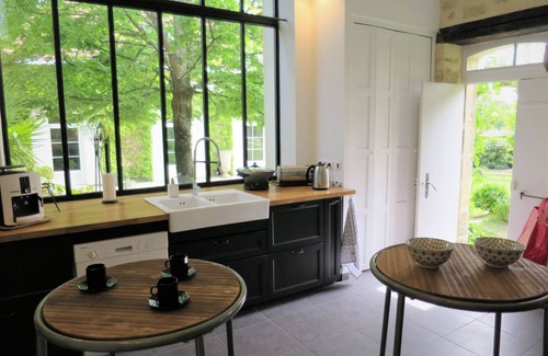 "La Vertheuillaise", 2-room house 80 m2 on 2 levels. Bright, beautiful and cosy furnishings: living/dining room with dining table, radio and CD-player. Exit to the garden. Large kitchen (dishwasher, 2 ceramic glass hob hotplates, toaster, kettle, microwave, freezer, electric coffee machine) with open-hearth fireplace (only for decoration). Exit to the garden. Shower/WC, double hand-basin. Upper floor: open gallery with sloping ceilings with 2 beds (90 cm, length 190 cm). 1 open room with sloping ceilings with rooflight with 1 french bed (140 cm, length 190 cm). Electric heating. Terrace furniture, deck chairs (4), box-room. Facilities: iron. Internet (WiFi, free). Please note: non-smoking house. Smoke alarm. Instead of an enclosed bedroom, some sleeping areas are located in an open-plan area (gallery, alcove, etc.). FR3157.651.1