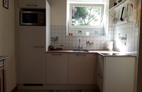 Kitchenette, fridge, microwave, electric kettle, toaster, coffee maker.
