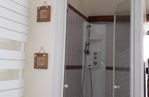 Upstairs: large bedroom with 1 bed for 2 people + small crib, (possibility of cot and high chair) sink, shower room and storage.