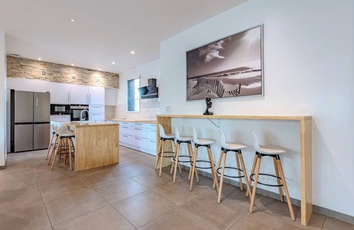 The villa boasts exceptional amenities, including an indoor heated pool and a state-of-the-art spa room complete with sauna and massage services for ultimate relaxation before or after your wedding festivities. Gather your loved ones in the spacious living areas, which can comfortably accommodate up to 15 guests. The expansive wooden terrace, perfect for hosting outdoor receptions, features ample seating and BBQ facilities. Enjoy the convenience of fully equipped kitchens and well-appointed bedrooms, ensuring that every detail caters to both comfort and style.