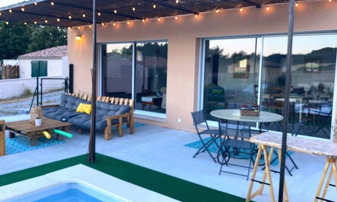 Depuis la grande terrasse et la piscine privée, profitez d’une vue panoramique sur les collines et laissez-vous bercer par la quiétude du lieu. L’intérieur, lumineux et soigneusement aménagé, vous offre tout le confort moderne pour un séjour en toute sérénité.