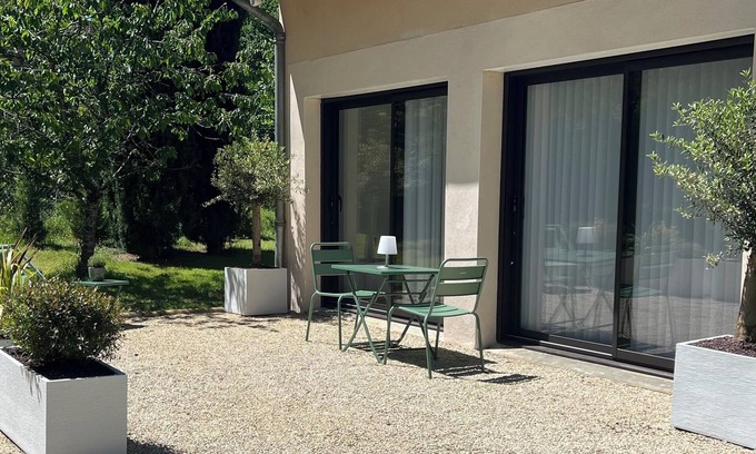 We offer you a 26 m2 character guest room in VILLA DIANE, an architect-designed house nestled in a quiet, wooded environment with high-end services: barbecue, heated swimming pool, covered panoramic terrace of 50 m2 and outdoor activities. outdoors. aerial activities such as canoeing, horse riding, electric bikes, culinary invitations.