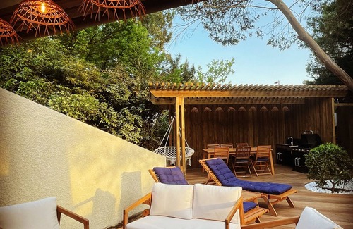 Relax in this quiet and stylish accommodation. This seaside villa is to be shared with family or friends. You will have several outdoor spaces, a relaxation or reading area under the pine trees. A summer kitchen area, a heated swimming pool for relaxing, as well as a wooden terrace with sun loungers for sunbathing or taking a nap under a magnificent eucalyptus tree.