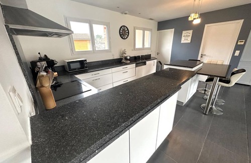 Welcome to Lit et Mixe, a small coastal village 7 km from wild beaches, 15 km from Lac de Léon and the Courant d'Huchet Nature Reserve, and with nearby cycle paths. We look forward to welcoming you for a comfortable stay with family or friends in this modern villa with an above-ground pool and outdoor spa. This cottage boasts an ideal location for enjoying the ocean, golf courses, the forest, and all the summer activities and entertainment while enjoying a peaceful stay. Ideal for a weekend or a week... Modern villa with an above-ground pool (7.32m x 3.66m, depth 1.32m, open from June to September depending on the weather) available for relaxing in the 3000m² enclosed garden with a Japanese garden. A terrace with garden furniture, a barbecue, and a plancha grill extends the indoor living space. This house (adjoining the owner's personal home) is large and bright. This single-story property comprises: a large living room with a lounge area (flat-screen TV, Wi-Fi, Netflix subscription, Blu-ray DVD player, soundbar), dining room, equipped kitchen (4 induction hobs, electric oven, microwave, extractor hood, dishwasher), pantry (American-style fridge, washing machine). 3 bedrooms (4 double beds, including 2 bunk beds), a bathroom (walk-in shower), a separate toilet. Thanks to the double bunk beds, two additional guests can be accommodated, for a maximum capacity of eight: a supplement of €50 per week per person is required. For your comfort, bed linens, towels, household linens, as well as electricity, water, and air conditioning are included in the price. Baby equipment can be requested: travel cot, high chair, and bathtub.