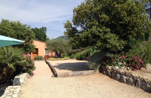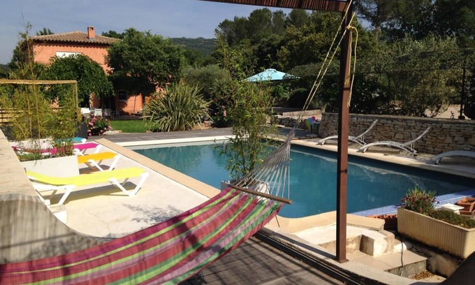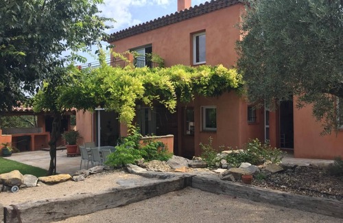 On the edge of forest, in a quiet, beautiful and great contemporary villa on a 3000 m² partly fenced proprietie in the heart of Provence. Electric gate, (9.5x5x1.8m, electric curtains) pool with sunbathing. Terraces with garden furniture and barbecue, table tennis and bowls. Solarium and hammock. Ground floor: Entrance Hall, kitchen open to living room and dining room, space games with billiards and table football, library. One bedroom with a double bed (140cm), 1 bedroom with two single beds (90cm), wc, laundry. First floor: parental airconditioned room with King-size bed (200x200cm), bathroom with wc, shower and whirlpool bath. A bedroom with a double bed (180cm), a bedroom with a double bed (140cm). Bathroom.