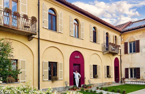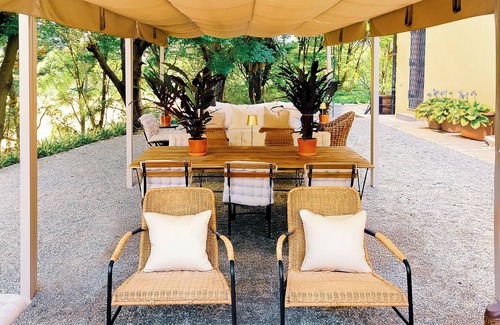 Salone di Bruno, the shared living room on the ground floor, invites guests to relax amidst vaulted ceilings, contemporary art, comfy antique furnishings, and a grand fireplace. French doors open onto il Giardino di Anna, a tranquil shaded garden perfect for unwinding with a book or a glass of wine.