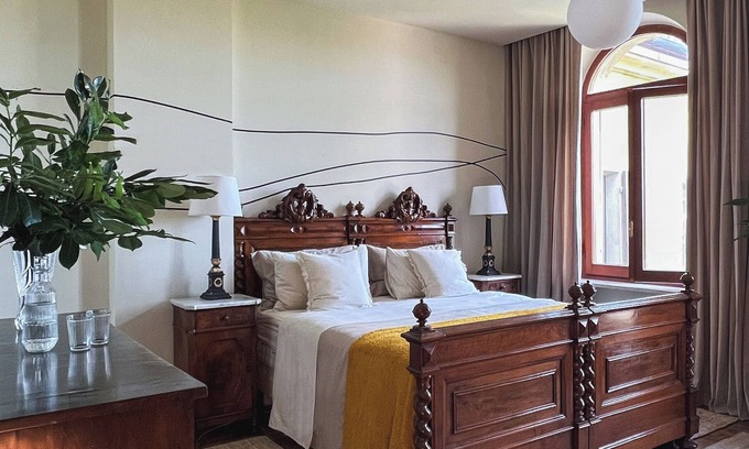 La Vilma Suite 460 sq ft located on the second floor, seamlessly blends Italian elegance with antique furnishings and contemporary art. Featuring two private balconies with views of Monviso mountain and the Italian Alps. The suite offers a sumptuous king bed (or two twin beds, upon advance request) dressed in fine linens, down or synthetic pillows and down comforters. Included is a continental breakfast and complimentary tea/coffee bar, as well as mini fridge with snacks and soft drinks (at an additional charge).The elegant bathroom includes a large pedestal sink, bidet, a deep soaking tub, premium toiletries, and soft towels. Perfect for solo travelers, couples, or families, La Vilma offers a spacious living room with a wardrobe, a secretary cabinet, a dresser, and a plush sofa-bed for 1 additional guests (upon advanced request).
