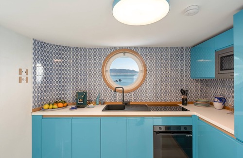 During the colder months, the warmth of the wood-burning fireplace provides a welcoming atmosphere. A comfortable sofa bed facing the TV and a dining table positioned against the sea view make every moment special. The kitchen is equipped with the latest generation appliances and a porthole window over the sink offering charming views.