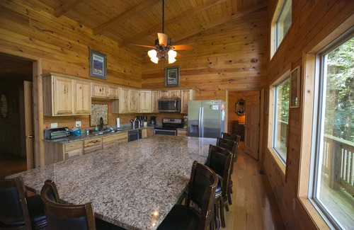 This well-appointed cabin features three comfortable bedrooms and three bathrooms, accommodating up to eight guests. Enjoy modern amenities including fiber optic Wi-Fi, an outdoor hot tub for relaxation, and a gas grill for delightful cookouts. Engage your guests with fun activities like a game of pool on the slate pool table or gather around the campfire pit under the stars. The spacious kitchen boasts granite countertops and modern appliances, making it easy to cater your wedding festivities or simply prepare a cozy family meal together. The master suite offers a king bed and a private bath, while the other two bedrooms provide delightful sleeping arrangements, ensuring everyone feels at home.