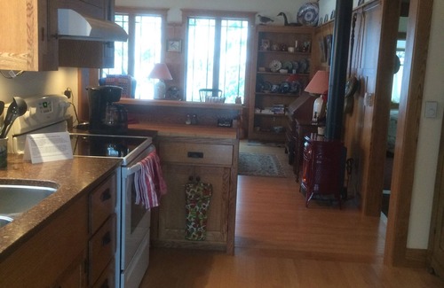 On Long Lake, Mercer Wi. Beautiful, exclusive, one-of-a-kind lake cottage, 1000 square feet. Living room/dining area, full modern kitchen, bedroom with king size bed, office includes a closet and washer/drier, 1 full bathroom, screened porch, patio. Hand-crafted cottage in the arts and crafts style, well appointed with antiques, oak paneling, hardwood floors, open paneled ceiling. Rent includes use of dock and swimming area with raft, unlimited use of kayaks, canoe, paddle boards, a 14-foot fishing boat, high speed internet, Direct TV. Shore and lake bottom are sandy with few weeds and no muck. Great view of the lake. Long Lake is a 450 acre lake with beautiful unspoiled shoreline and real wilderness in the north end. Good fishing for walleye, musky, pan fish, northern pike, bass. Waterskiing, swimming or just cruising the 11 miles of shoreline. The cottage was built in 2010 for my very fussy mother, who decorated it in her unique style. Monthly rental in season mid May-September, $90 per day with 30 day minimum. Discount for 2 or more months. Discount for October. We will work out a payment schedule with you for multiple months. Pet fee $100 per month.