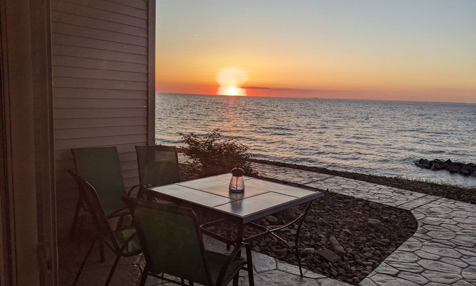 Our luxury resort condo is a DIRECT BEACH WALKOUT to beautiful Lake Erie. Sip your morning coffee or a glass of wine (purchased from a local winery) while relaxing on our covered patio directly on the lake. Master bedroom has king sized bed along with wood bunk beds with a full-size bed on the bottom, twin on top. Second bedroom includes a queen size pillow top bed. Spa amenities include large walk-in shower with 6 separate shower heads, relaxing rainfall shower head, and tiled bench to sit and enjoy being immersed in your luxurious shower. Second bathroom includes a full shower and an extra deep jetted-air tub. Geneva-On-The-Lake is a summer destination for many. This small town became Ohio's first summer resort! A true slice of Americana where John D. Rockefeller, Harvey Firestone and Henry Ford would come to camp, fish and have fun! Whether you are planning a family vacation, a couple's retreat, or a "girls" get-away, this remains a great place to unwind and have fun! SO MUCH to do: Nearby Wineries. Fantastic local restaurants. Golf. Arcades. Fishing. Geneva State Park (marina w/ fishing charters or dock rental for your own boat, bike rentals, hike/bike paths, zip-line)WE DO NOT ALLOW ANIMALS, even if they are small and well behaved. Do not rent for parties. Quiet time 10p-8a. 2 Night minimum****** It is illegal, pursuant to the Ohio Fair Housing Law, Division (H) of Section 4112.02 of the Revised Code and the Federal Fair Housing law, 42 U.S.C.A. 3601, as amended, to refuse to sell, transfer, assign, rent, lease, sublease or finance housing accommodations, refuse to negotiate for the sale or rental of housing accommodations, or otherwise deny or make unavailable housing accommodations because of race, color, religion, sex, familial status as defined in section 4112.01 of the Revised Code, ancestry, military status as defined in that section, disability as defined in that section, or national origin or to so discriminate in advertising the sale or rental of housing, in the financing of housing, or in the provision of real estate brokerage services. It is also illegal, for profit, to induce or attempt to induce a person to sell or rent a dwelling by representations regarding the entry into the neighborhood of a person or persons belonging to one of the protected classes.