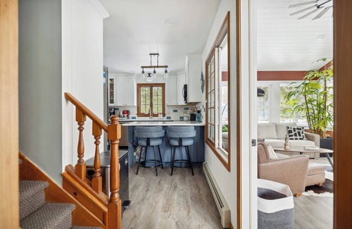 The bedrooms offer a perfect blend of comfort and charm. The primary suite features a queen-sized bed, elegant wood furnishings, and an en-suite bath for ultimate relaxation. The second bedroom, with its cozy full-size bed, exudes a peaceful, retreat-like feel, while the third bedroom boasts a versatile Murphy bed, seamlessly transforming the space from a guest room to a functional area as needed.