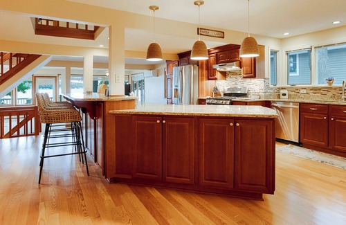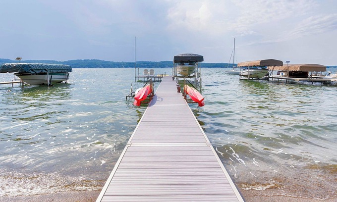 Your experience at Lake Escape is enhanced by its impressive amenities designed for relaxation and entertainment. The heart of the home features a spacious DREAM Kitchen equipped with custom cherry wood cabinetry and a gleaming granite island, perfect for hosting family and friends. Gather around the fireplaced dining room or unwind in the great room, where oversized furniture and expansive windows invite stunning lake views throughout the day. For outdoor gatherings, the covered porch and lakeside patio offer additional space to celebrate while soaking in the natural beauty surrounding you. Rest comfortably in one of the four beautifully appointed bedrooms, ensuring that both you and your guests feel at home during your stay.