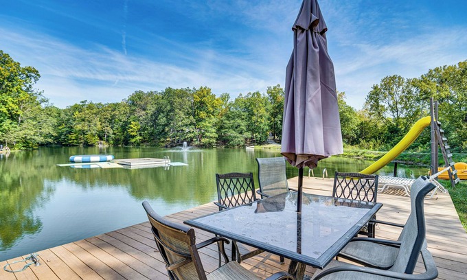 Make a splash with family and friends when you retreat to this 3-bedroom, 2-bath vacation rental in Hope, Indiana! Spend your days paddling along the lake's beautiful fountain while the kids play on the water trampoline and slide. After exploring the nearby Anderson Falls, gather around the fire pit for s'mores or cheer on your favorite team at the home's private bar. Your unforgettable getaway awaits!