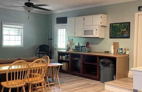 Upper Cottage: 2 bedroom with 1 full bath with open living room space with beautiful heating and cooling (includes couch, TV, wireless internet, kitchen table, refrigerator, microwave, washer/dryer). Also, the Upper Cottage has a large fenced in area off the side of the house.