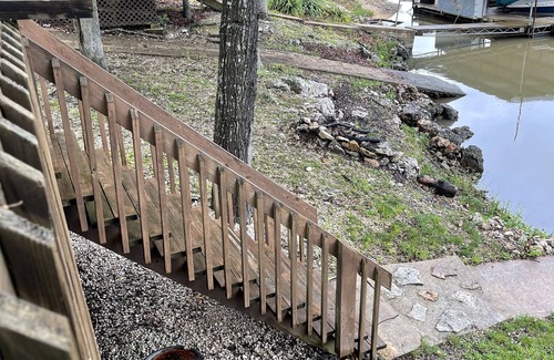 There is a boat dock with electricity directly in front of the cabin with a fish cleaning table and running water that is connected to a hose and the faucet is up on the one side of the cabin. It also has a swimming deck. NO DIVING ALLOWED. There are cleats to tie up your fishing boat and plugs to charge the battery, with exception during the low pool times (March-Memorial Day & possibly low after Labor Day. You would need check with us) This is a quiet cove that does not get large waves from the main channel.