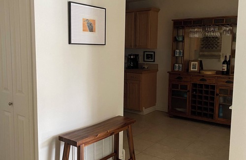 A bar adjacent to the kitchen includes additional glasses, wine openers, and oversized coffee mugs. We think these mugs, filled with coffee, are perfect for watching the sunrise from the deck. There is a small dining table with an expansion leaf that extends to seat 4 -6 and an extended counter with four stools in the dining area. On the deck, you'll find a small gas grill with utensils.