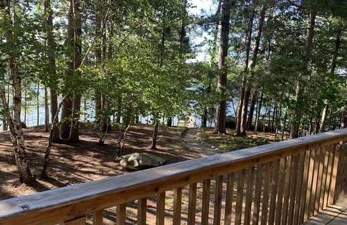 The cottage has a large open deck off the front, with panoramic views through a beautiful thinly forested shoreline of stately Norway and White Pine, along with Birch, Maple, and Oak hardwoods. One bedroom has a king-size bed and an adjacent full bath, another has a queen-size bed with adjacent half bath, and a third bedroom has a queen, a full, and two twin beds. The cottage also has a large sitting room with a queen-size hide-a-bed sofa for sleeping.