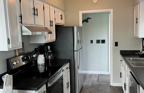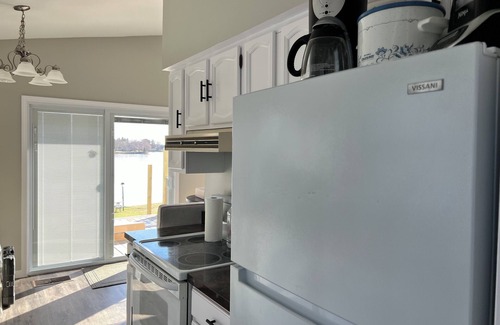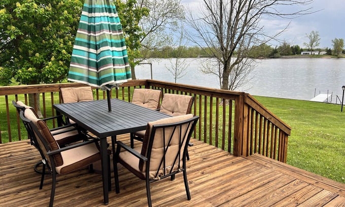 Relax with family and friends at this peaceful lakefront cottage. We have everything you need to have a fun and relaxing stay. Amazing views from the large deck with relaxing outdoor furniture. So many extras with this rental, such as kayaks, cornhole boards, fishing poles, board games, beach chairs, paddleboat, and much more. If you’re looking for a fun and relaxing place to stay, this is the place. It’s a three bedroom two full bath house. First bedroom has a queen bed with a closet and dresser. Second bedroom has two full beds and closet. Third bedroom has 2-3 bunk beds and sleeps eight. Living room has a couch and a recliner. Kitchen is equipped with everything you need a table that seats four and a Bar top with two barstools. We have a stackable washer and dry in hallway closet. Outside a table with six chairs, a two seat lounger, two gravity chairs, fire pit with chairs and a grill. We have a dock to bring a boat or rent one from us. We also have a pontoon available to rent.