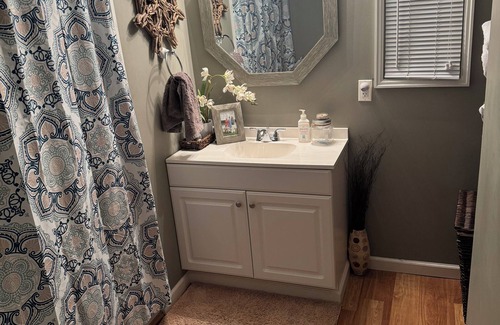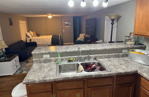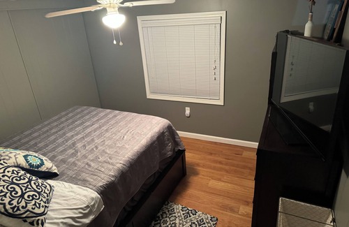 The living room has a futon that converts into a full-size bed, as well as a twin trundle for extra sleeping arrangements. Home features a fully stocked kitchen with coffee pot, blender, toaster, waffle maker. In-home washer & dryer. Master bedroom has a queen size bed. All linens provided.