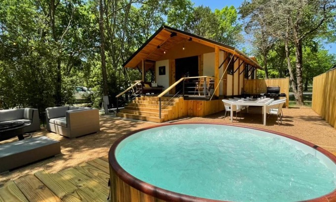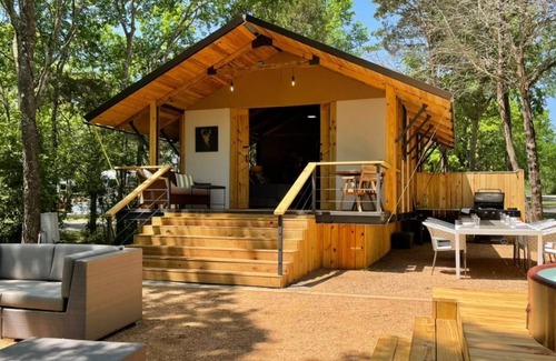 Enjoy nature and the beautiful shores of Lake Bastrop without the inconveniences of camping. Combining luxury with nature, this cabin sleeps six comfortably with custom furnishings, stylish decor, and your own private restroom with a large vanity and shower.