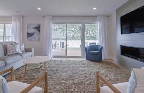 This lakefront home has all new cabinetry, luxury vinyl planking, updated bathrooms, quartz countertops throughout, and much more. The kitchen is spacious with an 8' white oak island, wine fridge, Keurig coffee maker, regular coffee maker, ninja blender, toaster, all new GE Profile appliances, and is stocked for most of your cooking needs. As you stand in the kitchen you will be captivated by the expansive 18 feet of glass overlooking a stunning view of the water. There is a cozy lakeside living room with an electric fireplace providing heat as well as accent lighting for any occasion. Outside there is a sprawling deck with ample seating, a propane grille, a covered sitting area, and outdoor dining table for enjoying a meal in the sunshine. Off to the side there is a patio with a Jacuzzi hot tub! The yard has tons of space for yard games, there is a swing set for smaller children, and a well manicured beach with lounge chairs and a dock to enjoy the water.