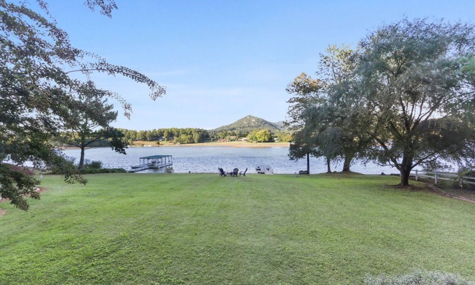 Deep water, year round, lake front home with fantastic deck overlooking mountains, lake, boat dock, large-flat yard. Enjoy the kayaks, lily pad, fire pit or indoor fireplace and gas grill. Home includes master-suite (king), guest room (queen), bunk room (2 bunk beds) and two full bathrooms. The bonus room also includes a futon (full) and twin bed. Kayaks and Lily pad are available. Parking available for 3-4 cars, no smoking, and no pets. Brasstown Bald, GA Mountain Fair Grounds, hiking trails, vineyards, and plenty of boat rental companies, restaurants, breweries, and shops are in the area! Kayaks (2 adult,1 child) and lily pad are available as well, just reach out!