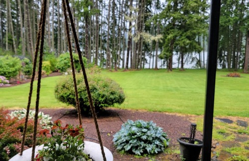 Beautiful garden landscaping, lawn rolls down into the lake. Spectacular view. Roll up glass door opens living space into the coveted patio and yard. Lots of parking. Horseshoe pits bbq swim spa . hiking biking lake activities close by.