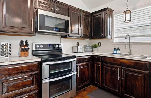 Fully stocked kitchen. Includes stainless steel appliances, all the essential pots, pans, baking dishes, cookware, cooking sheets, assortment of spices, etc. Extra amenities include a combo K-Cup and regular brew pot coffee maker, Ninja Blender, toaster, hand blender, large stock pot, crock pot, outdoor glasses/plates/bowls, outdoor serving platters, BBQ tools, etc.