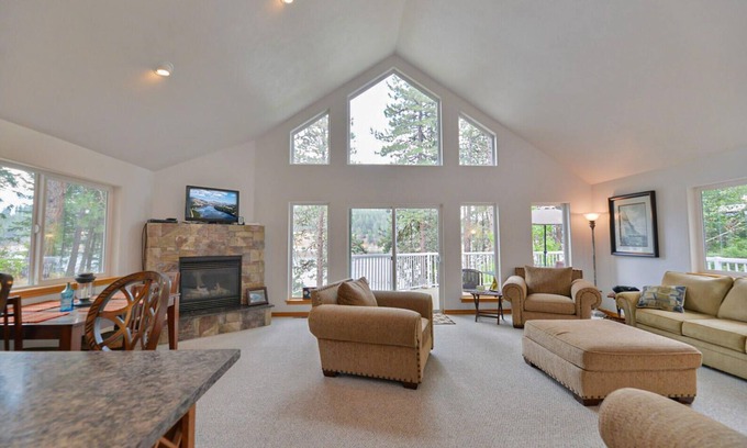 1800 square feet of living with a daylight basement, 4 bedrooms/sleeping areas (2 non-conforming), a Queen pull-out sofa sleeper in the living room, a full bathroom on each level, cultured stone and granite fireplaces in the living area and master bedroom, and large picture windows leading out to your wrap-around Trex deck for GORGEOUS views. Gated access for privacy along with plenty of parking space. Full kitchen, comfy furniture, and lots of privacy! Patio furniture and a gas BBQ grill are provided.