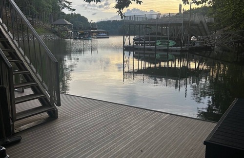 Live large on Lake James in this luxurious, modern, 4-bedroom retreat that has it all!!! Huge 2-tier dock with great views, diving platform, paddle board, & kayaks. Watch the sunset on the dock, on the lake, or catch the sunrise by the dock while fishing. This brand new construction 3600 square foot 2-story home caters to adults and kids. 2 Master suites on the top level with large open floor plan great for hosting, and large game room, wet bar area on the bottom floor by the kids rooms. Enjoy your coffee on the huge spacious top floor deck or use the blackstone grill, play cornhole, or hang out by the firepit on the bottom level full patio. This house has free wifi throughout the property down to the dock. Bring your boat and dock on the lot, or property owner has jet ski, boat rental options. Quick boat ride to Bear Creek Marina, and easy boat ramp access. Deep water, peaceful no wake cove that is perfect full day floating, grilling out diving, boating, fishing… you name it!Gated community in The Arbor that will not disappoint. Kitchen fully stocked with air fryer, 2 coffee machines, crock pots, etc, as well as downstairs bar loaded with tall beer glasses and ice maker. House is fully stocked with trash bags, toilet paper, paper towels, laundry detergent, etc… We take care of it all! Dining room table expands to fit 10-12 for sit down dinners, and large spacious deck is perfect for morning coffee or dinner drinks when not on the dock! This gem on the lake is a rare find. Get a few families together, invite some friends and enjoy this property new to Lake James in The Arbor. Perfect getaway for all seasons...