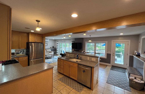 For those who enjoy culinary adventures, our outdoor kitchen is a true delight. Complete with a grill and Blackstone flattop, you can prepare mouthwatering BBQ feasts and savor them al fresco style. Inside, the home features a spacious open living area with 55 inch smart tv, dinette, fully equipped kitchen with gas stove, two refrigerators and coffee bar. Plus fully equipped laundry room, making it convenient for longer stays. After a day of outdoor fun, unwind around the firepit under the starry night sky, sharing stories and roasting marshmallows.