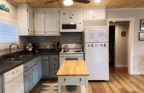 The kitchen has a stove/oven combo, microwave, dishwasher and refrigerator. There is a small, movable kitchen island for added preparation space. We have you covered with a drip-coffee maker as well. You will definitely want to enjoy your morning coffee on the outdoor porch.
