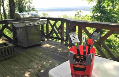 Kitchen-pots, pans, dishes, utensils-coffee maker Keurig & French press. Coffee & powder creamers. Fry baby, toaster air fryer,!waffle maker, baking dishes. All you need to make & serve your meals. In addition, the outside deck comes with a picnic table & gas grill. Enjoy an evening fire inside the living room fireplace or outdoor fire pit with the lake view. Living room has board games books, magazines, TV Roko. High speed internet. Picnic basket with wine glasses and breakfast in bed tray for your use.