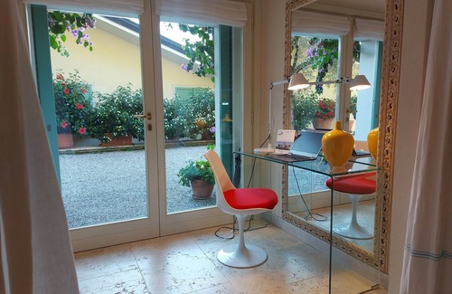 The luxury studio apartment, which can comfortably accommodate two people, is approx 35 square meters and consists of a bedroom with king size bed, kitchen, bathroom, closet and hallway with table and chairs. It is situated inside a large property with garden and swimming pool and it stands in a separate building behind the main villa. It is equipped with air conditioning, heating, TV, Wifi, bed linens and towels, hair dryer, shower gel and shampoo, iron, ironing board, safe. The kitchen allows the preparation of breakfast and quick meals and is equipped with electric stove, microwave oven with grill function, refrigerator and freezer, American coffee machine, kettle. You will always find in the kitchen oil, balsamic vinegar, salt and pepper, a welcome minibar, coffee, tea, sugar. The guests have access to a large swimming pool (18x6 meters) located in the beautiful garden of the villa, with stunning views of the lake below. The pool area is equipped with comfortable chairs, sunbeds, tables, umbrellas, hot shower, Wifi and it is rarely shared only with the owners. Guests are provided with large pool towels and can also enjoy free use of two mountain bikes to explore the beautiful trails on the hill behind and can of course park their car inside the property.