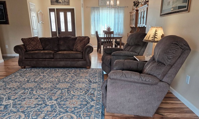 Guests will love the spacious living room. A cozy wood stove, radiant floor heating, and warm Montana-inspired décor add to the inviting atmosphere. The home is also equipped with high-speed WiFi and smart TVs for your convenience.