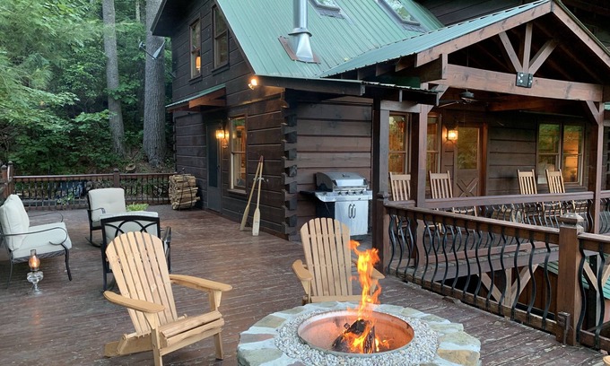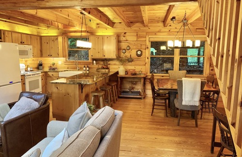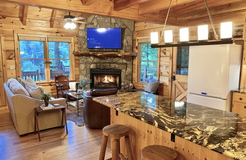 2 bed, 2 bath, and a grand open loft with 2 Log single beds and beautiful lounge/gaming area - foosball table, game table, 50” TV, xbox360 game console and board games. Luxurious King master bedroom with extensive private balcony - rocking chairs and chair hammock for relaxation. Beautiful stone countertops throughout the cabin and an oversized rustic stone fireplace in the great room. Wireless Internet. 55” (over fireplace) and two 32" smart HDTV’s in bedrooms with surround sound, bluetooth speakers. Gorgeous dining space overlooking a rustic natural earth landscape and open to the large kitchen and living space. Large covered porch and expansive open deck with oversized firepit. Firewood provided. Lake access and private dock. Boat available for fishing.
