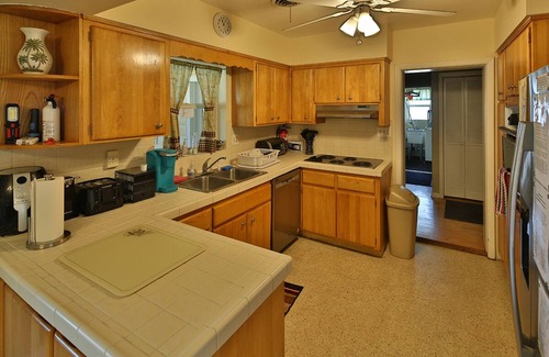 The floor plan is split with the master bedroom on one side, and the two other bedrooms on the opposite side of the house. The 2nd bedroom is large, with two closets with a full size bed & trundle bed that open to two single beds. The 3rd bedroom is the smallest and contains a queen size bed, large closet, a desk, and dresser. The living room is large and has a large sectional leather couch, a chaise lounge, recliner and the entertainment center. There is internet, Wi-Fi and basic 140 channel HD cable TV. The dining room and kitchen are side by side. The dining table can easily seat 6 people. The kitchen is large and has plenty of counter space. It has a brand new fridge with water & ice maker, & a new dish washer. Please clean all dirty dishes & pots and pans after use. Do not leave them in the sink. Please do not put them away dirty.
