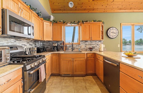 You will find the outdoor activities here are endless. Whether you want to relax on the sandy beachfront, take your boat on the water, go fishing, gather for dinner, pass away the time around the gas fire pit, or soak in the Hot Tub it's all just a few steps outside where the outdoor furnishings won't disappoint. Choose from meals overlooking the water from the deck or waterside from the patio, enjoy your morning coffee from the high top on the deck or on the water from the landing area of the dock. The choice is yours with no hassle. Outside you can also enjoy a friendly game of corn hole or bocce ball and grill out on the charcoal grill.