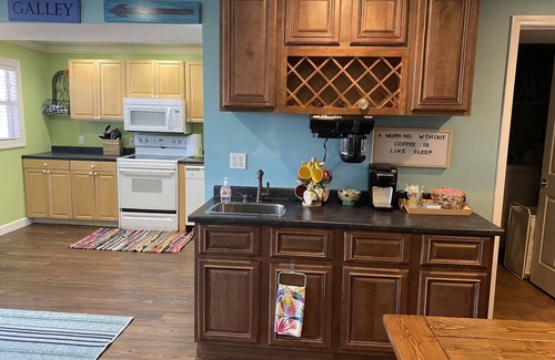 Our family friendly home is a two-story 1,500 square foot home with 2 bedrooms, a loft, 2 bathrooms and 2 entertainment spaces. The main floor has 2 bedrooms (one with a queen bed the other with a queen and twin bunk bed), a half bath, large family room with entertainment setup and seating for 6-8. The family room also includes 2 large picture windows with awesome view of the yard and a door leading to upper deck. The loft has a queen bed, full-size futon, and TV; the perfect hangout for kids and teenagers. The lower level has a well-appointed kitchen (service for 8), full bath with tub/shower (with washer and dryer) and large dining room with a family style farm table; including TV, plenty of rainy day activities like puzzles, coloring books, board games and card games.
