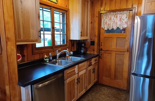 Inside the cabin is a brand new kitchen, brand new SS appliances including a dishwasher (a must when on vacation). Everything is fully stocked, pots, pans, silverware, coffee pot, Keurig machine, extra towels, just bring your clothes and toiletries. There are lovely water views from the living room and master bedroom. Two private bedrooms on main level and upstairs has 4 beds, two doubles and two twins and an air condition to make it more comfortable. Living room as a 50 inch t.v. and internet included to stream all your favorite movies or shows. There are two full baths and a stackable washer and dryer for small loads.